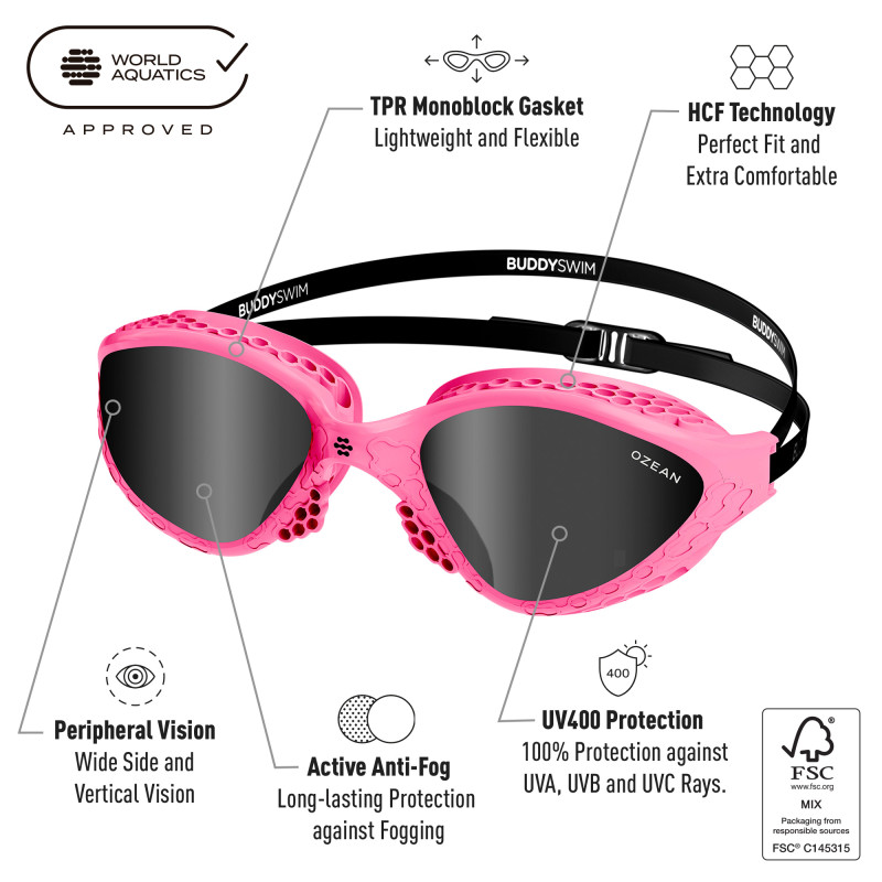 Die Buddyswim Ozean Schwimmbrille bietet ein weites Sichtfeld bei maximalem Komfort und Passform. Ausgestattet mit der HCF-Technologie, dem TPR-Monobloc-Rahmen und den Panoramagläsern wurde diese Schwimmbrille entwickelt, um Ihr Freiwasser- und Triathlon-Erlebnis zu verbessern. Genießen Sie beim Schwimmen klare Sicht und UV-Schutz, ohne sich Gedanken über Undichtigkeiten oder Beschlagen zu machen.