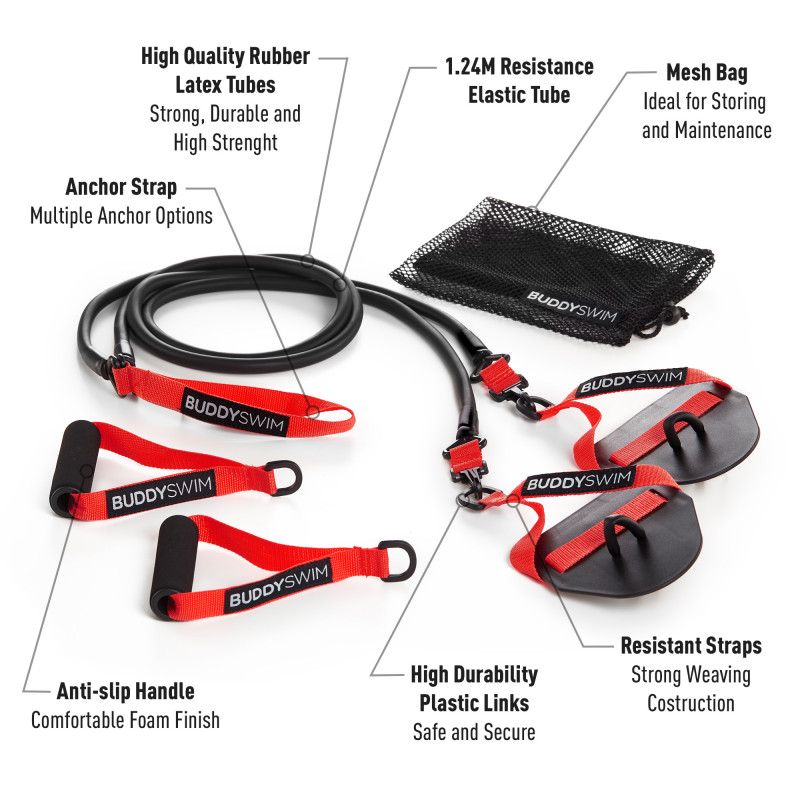 Buddyswim Resistance Rubbers mit austauschbaren Paddeln und Hebeln sind für Trockenschwimmübungen konzipiert. Das Training für Schwimmer außerhalb des Wassers ist eine wesentliche Ergänzung zur Verbesserung der Schlagausdauer und -technik. Dank der Möglichkeit, Paddel oder Hebel zu verwenden, kann der Schwimmer unzählige Übungen aus dem Wasser ausführen, wie Rotationen, Zug, Extensions, Kraftübungen und vieles mehr.